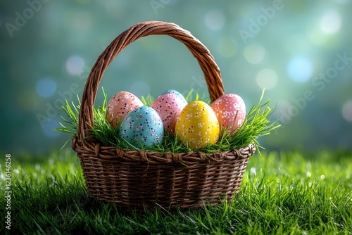 easter, egg, basket, grass, colourful, holiday, spring, decoration, wicker, festive, celebration, vibrant, outdoors, nature, traditional, spotted, pastel, springtime, bokeh, greenery, texture, shadow, sunlight, arrangement, seasonal, artistic, craft, symbol, bright, culture, joy, gathering, motif, custom, ornament, event, hand-made, lush, meadow, cheerful, cosy, design, serene, heritage