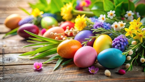 Colorful Easter eggs placed on a table decorated with spring flowers and greenery, table, spring, table,spring