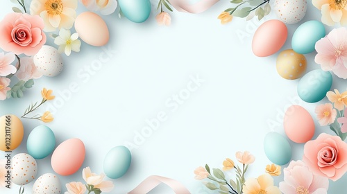 Colorful Easter eggs surrounded by delicate flowers on a soft blue background, perfect for spring-themed designs and celebrations.