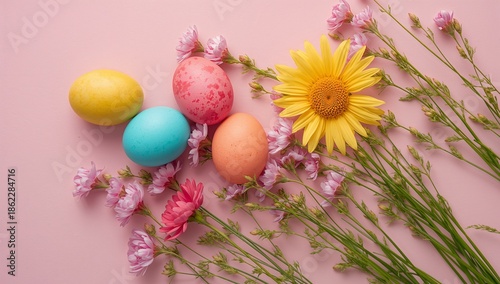 Colorful Eggs and Flowers Arranged on Pink Surface for Spring Celebration