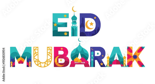 eid, islamic, greeting, celebration, festival, religious, holiday, typography, text, letter, colourful, design, illustration, decoration, crescent, moon, star, gold, teal, orange, purple, blue, abstract, pattern, background, white, ramadan, faith, joy, peace, community, tradition, culture, muslim, wishes, art, graphic, modern, celebratory, spiritual, festive