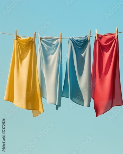 fabric, clothes line, colourful, textile, hanger, sunlight, bright, blue skies, yellow, blue, red, outdoors, swirling, soft, fashion, drama, color palette, flowing, hanging, summer, warmth, natural, juxtaposition, artistic, pastel, light, composition, design, casual attire, whimsical, daylight, tranquil, breeze, decorative, clothes, drape, stylish, home decor, silk, cotton, kaleidoscope, hue