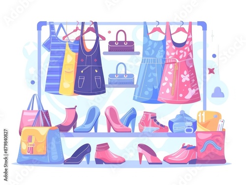 fashion, clothing, shoe, bag, dress, sandal, heel, boot, purse, pursed, shopping, retail, style, trend, colourful, illustration, graphic, design, vector, flat, cartoon, modern, minimalist