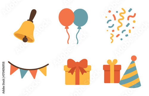 Colorful festive icons with balloons, confetti, gifts, and celebratory elements