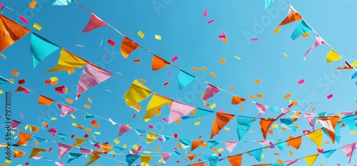 Colorful flags and banners hanging in the sky during festivals Generative AI