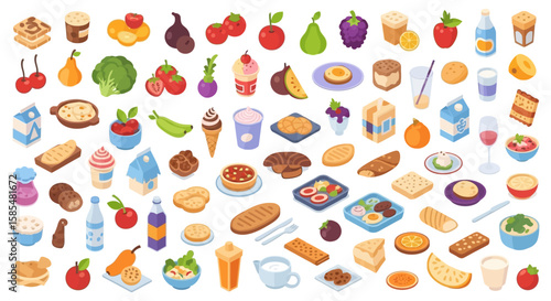 food, drink, icon, colourful, flat, cartoon, isometric, fresh produce, fruit, vegetable, dairy, milk, yogurt, juice, water, dessert, ice cream, cake, pastry, meal, breakfast, dinner, snack, bakery, sweet, savoury, health food, beverage, hot drink, tea, alcohol, smoothie, cooking, ingredient, cookery, nourishment, eatery, cafes, grocery, supermarket, diet, lifestyle, menu, presentation, graphic