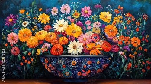flower, bowl, floral, arrangement, table, dark, background, colourful, decorative, painting, bloom, bouquet, still life, art, decoration, blossom, vase, garden, nature, colours, design, beauty, home, spring, summer, bright, vibrant, plant, botany, daisy, orange, yellow, pink, purple, white, green, blue, interior, gift, romance, love, happiness, joy, fresh, gerbera, wildflower, poppy, rose