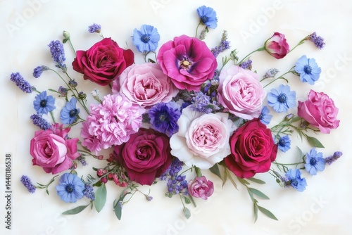 flower, rose, arrangement, colourful, vibrant, pink, purple, blue, blossom, flower petals, sprig, stem, delicate, bouquet, floral, display, background, light, white, texture, top, view, composition, pattern, decoration, beauty, nature, spring, summer, bloom, gentle, soft, decorative, elegant, pastel, mixed, variety, detail, close, up, image, photo, still, life, design