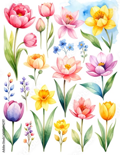 flower, floral, spring, summer, watercolor, illustration, design, botanical, art, colourful, pastel, tulip, daffodil, lily, peony, wildflower, leaf, nature, element, arrangement, digital, pattern, background, texture, decoration