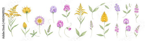flower, flora, illustration, colourful, spring, nature, vibrant, botanical, yellow, purple, green leaf, springtime, art, design, floral arrangement, wildflower, garden, decorative, graphic, hand-drawn, digital artwork, beauty, leaf, flower petals, vivid colors, aesthetic, creative, natural, seasonal, delicate, fresh, charming, stylised, whimsical, floral pattern, color palette, environment, scenery, artistic, environmentally friendly