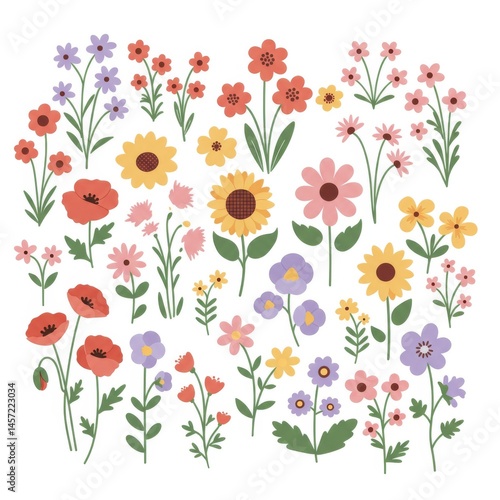 flower, floral, botanical, illustration, design, summer, spring, nature, plant, wildflower, sunflower, poppy, daisy, yellow, red, pink, purple, orange, pastel, colourful, bright, cute, pretty, charming, simple, flat, graphic, artwork, pattern, texture, background, wallpaper, card, invitation, decoration, element, set, collection, isolated, white