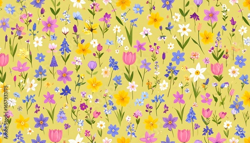 flower, pattern, floral, spring, summer, background, wallpaper, design, textile, illustration, seamless, digital, art, nature, colourful, vibrant, pastel, yellow, pink, blue, purple, cute, pretty, garden, springtime