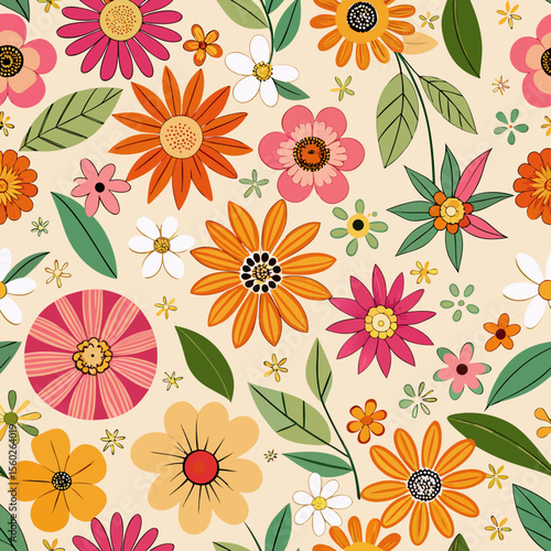 Colorful Floral Pattern with Retro Style Featuring Various Flowers and Leaves on a Light Beige Background Seamless Design