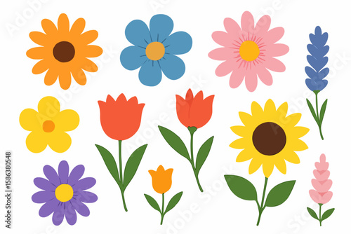 Colorful flower collection, cheerful, vector illustration, floral design
