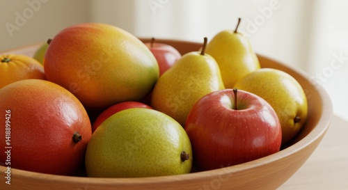 fruit, mango, pear, apple, orange, bowl, wooden, still, life, food, fresh, vibrant, colourful, juicy, ripe, healthy, delicious, natural, organic, vitamin, sweet, tart, bright, yellow, red, green, light, closeup, photo, table, kitchen, home, interior, decor, composition, arrangement, texture, glossy, shiny, smooth, round, shape, object, abundance, harvest, summer, spring, epicure