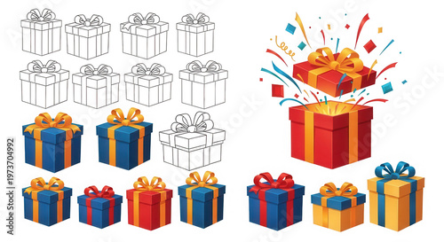gift, box, present, celebration, surprise, confetti, colourful, holiday, party, festive, ribbon, bow, package, open, reveal, birthday, christmas, event, special, outline, drawing, icon, illustration, element, vector, set, collection, assortment