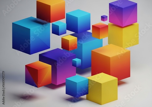 cube, gradient, colourful, floating, abstract, geometric, shape, modern, design, background, three-dimensional, rendering, composition, bright, vibrant, block, illustration, art, wallpaper, element, graphic, texture, concept