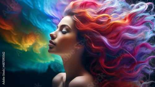 fashion model, vibrant, beauty, creativity, many-coloured, coiffure, glamour, elegance, artistry, style, wave, luxurious, portrait, aesthetic, hair care, high-coloured, modelling, copy space, generative