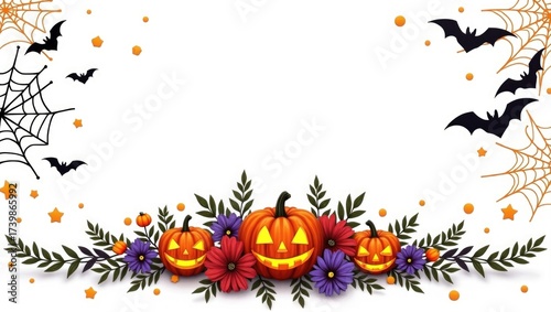 Colorful Halloween decorations with pumpkins, flowers, and bats on a white background for festive celebrations