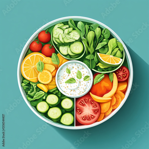 Colorful Healthy Plate with Vegetables, Protein, Grains, and Fruits