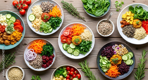 Colorful Healthy Vegan Buddha Bowls with Fresh Vegetables, Grains, and Legumes.