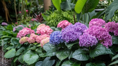 Colorful Hydrangeas in Vibrant Tropical Garden