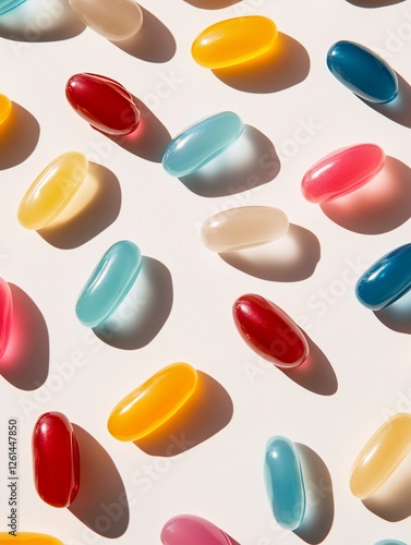 Colorful jelly beans scattered on white background, illuminated by sunlight, casting shadows.