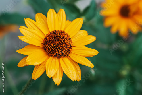 Colorful juicy yellow flower with orange center and vivid pleasant pure petals. Flowering jerusalem artichoke in macro. Blossoming helianthus tuberosus close-up. Beautiful flower of topinambur.