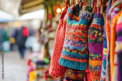 Colorful knitted crafts displayed in a vibrant street market during a sunny afternoon, Colorful knitted crafts hanging on street market stall with blurred background