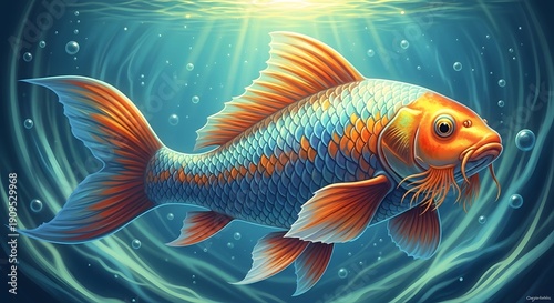 Colorful koi fish swimming underwater with glowing light rays