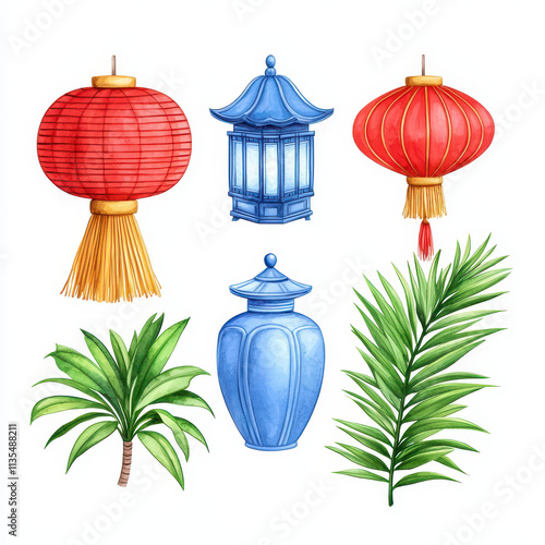 lantern, red, blue, plant, decorative, tropical, palm, vase, traditional, asian, culture, home, decor, nature, art, watercolor, bright, festive, ornamental, greenery, design, botanical, still, life