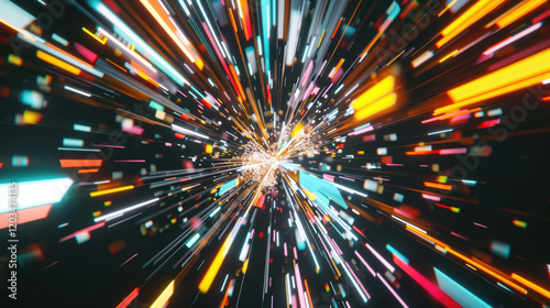 Colorful light streaks create dynamic explosion effect, representing speed and energy in vibrant digital space. This abstract design captivates with its vivid colors and motion