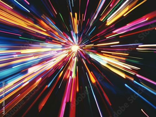 Colorful light streaks on a black background, a starburst effect, vibrant colors, a motion blur, speed lines, high-speed photography, a wide-angle lens, a night scene, a festive atmosphere.