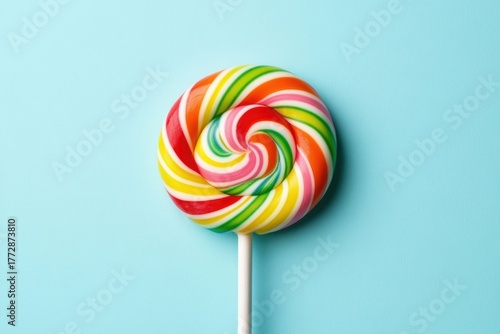 lollipop, happy, delicious, fun, childhood, swirl, spiral, colours, sucker, sweet, dessert, food, sugar, colourful, blue background, topview, studio shot, colourful, pattern, round, vibrant, sugary, treat, confectionery, snack, rainbow, stripes, contrast, light, blue, red, orange, yellow, green, pink, circle, bright
