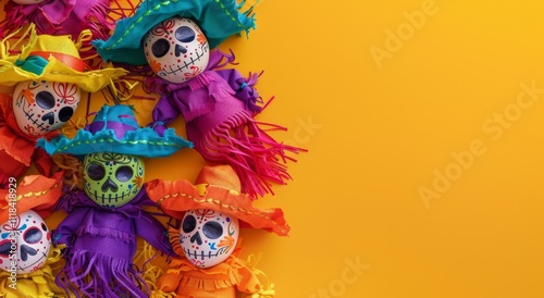 Colorful Mexican Cinco de Mayo banner with A row of colorful skulls with hats on top of them. The hats are in different colors and sizes