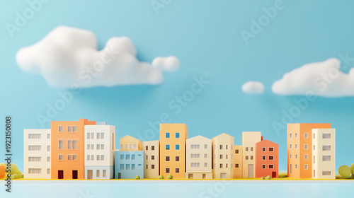 city, building, apartment, residential, skyline, miniature, pastel, facades, urban, neighbourhood, row, block, architecture, modern, exterior, town, street, housing, home, real estate, condominium, daylight, cloud, blue skies, sunny, warm light, suburban, render, illustration, model, window, door, balcony, sidewalk, tree, shrub, landscaping, playful, whimsical, calm, peaceful, community, compact