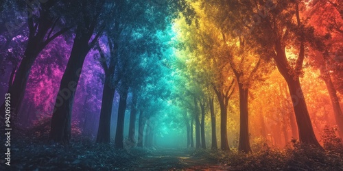 forest, tree, wood, path, sunlight, foggy, mystic, magical, enchanted, colourful, rainbow, fantasy, nature, summer, green, blue, yellow, orange, red, purple, dream, surreal, mystical, mysterious, twilight, aethereal, ambience, atmospheric, vibrant
