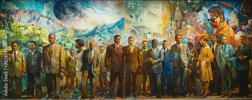 Colorful mural depicting diverse people and historical figures in a dynamic scene.