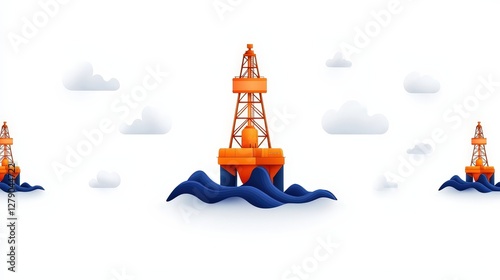 Colorful Offshore Oil Platforms Surrounded by Water and Clouds in a Minimalistic Style
