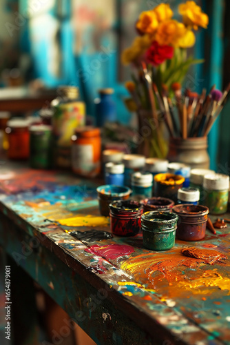 Colorful paint jars and brushes on a rustic table in an artist's studio with vibrant flowers