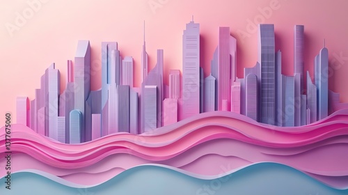 Colorful paper city skyline with pastel waves for creative urban illustration whimsical storytelling papercut Colorful paper city skyline with pastel waves. nature-inspired paper art