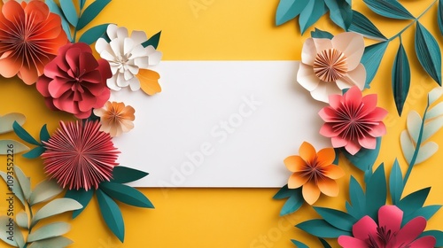 flower, leaf, paper, craft, colourful, orange, red, pink, white, teal, yellow, background, card, blank, space, design, floral, art, hand-made, decoration, template, invitation, greeting, message, spring, summer, vibrant, bright, pretty, delicate, origami, folded, texture, pattern, nature, botanical, frame, border