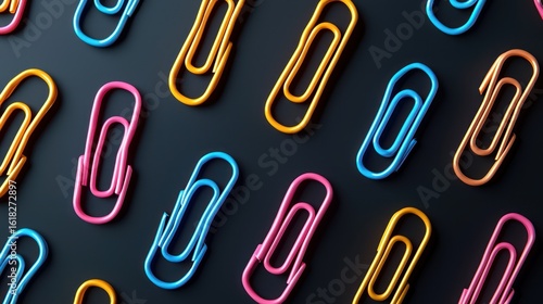 Colorful paperclips pattern on dark background; office supplies flatlay