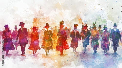 parade, historical, figure, watercolor, colourful, art, festival, brightness, costume, celebration, background, people, tradition, joyful, vibrant, attire, walking, scenery, beauty, creativity, design, impression, oneness, heritage, culture, artistic, cheerful, elegant, shadow, light, contrast, movement, style, event, expression, community, nostalgia, togetherness, visual, imagination, detail, craft, performance, artistry, atmosphere