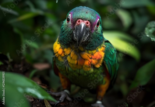 Colorful parrot perched among lush green foliage in tropical habitat