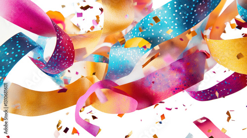 Colorful party streamers and confetti on a white isolated background.