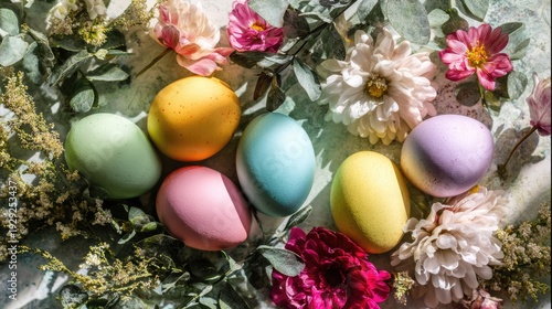 Colorful pastel Easter eggs with spring flowers and greenery festive arrangement