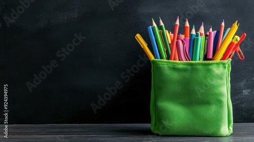Colorful Pencils and Pens in a Green Pouch on a Blackboard