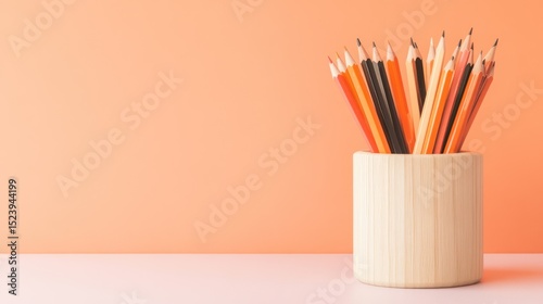 colourful, wooden, container, peach, background, stationery, desk, organised, sharp, writing, art, school, study, education, drawing, supply, creativity, vibrant, collection, various, shades, orange, red, brown, black, yellow, simple, minimal, still life, closeup, object, pastel, light, design, home, office, product, classroom, learning, graphic