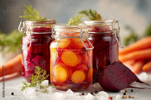Colorful pickled carrots and beetroot displayed in jars with fresh carrots in the background